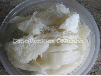 Numa tigela grande, lavar os fios da gila em 3 águas e depois deixá-la de molho em água no frigorífico, pelo menos 24 horas;