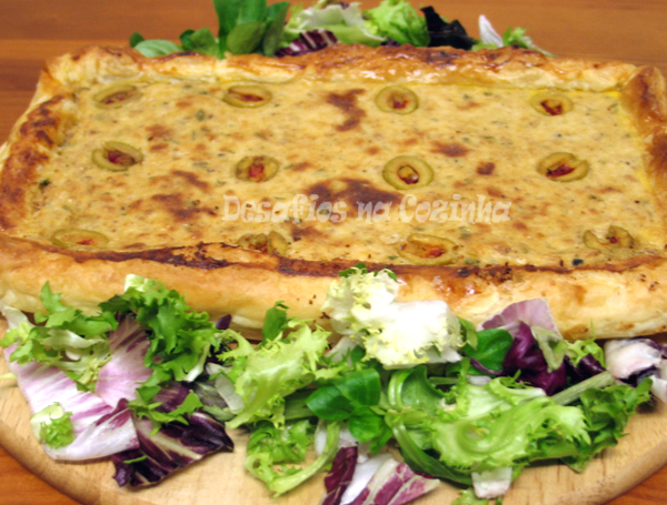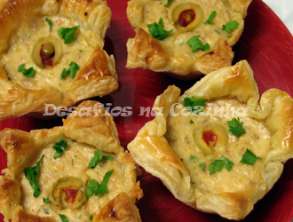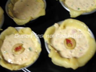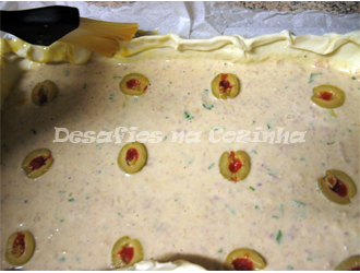 5. Encher as formas com o preparado anterior, pincelar a massa com ovo batido e decorar com azeitonas recheadas com pimento, partidas ao meio.