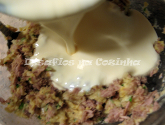 3. Numa tigela deitar a pasta de grão e adicionar a cebola picada, a salsa picada e o atum. Misturar sem bater;