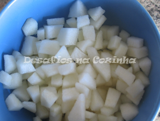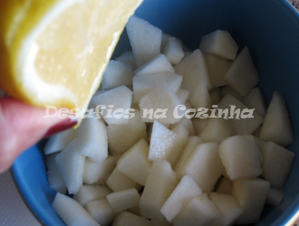 2. Partir a pêra em cubos pequenos, regar e envolver em sumo de limão para não oxidar;