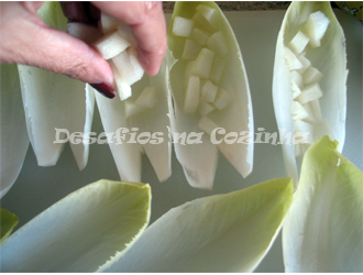 3. Colocar os cubos de pêra dentro de cada folha de endívia;