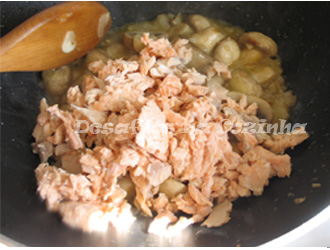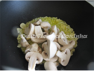 4. Juntar ao refogado de cebola os cogumelos partidos ao meio. Deixar cozinhar um pouco;