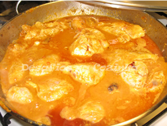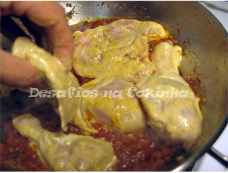 8. Juntar o frango e envolver no molho. Tapar o tacho, manter o lume baixo e deixar cozinhar cerca de 5 minutos, mexendo de vez em quando para não queimar;
