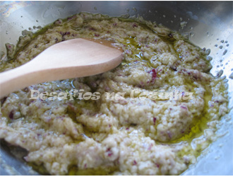 3. Num tacho colocar a pasta de cebola e alho, juntar 4 colheres de sopa de azeite e levar ao lume até alourar;