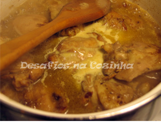 3. Quando o frango estiver louro, acrescentar uma colher de chá de alho em pó e o vinho branco aos poucos;
