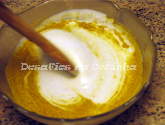 4. Entretanto, deitar numa taça o leite de coco e o caril, misturando os dois ingredientes;