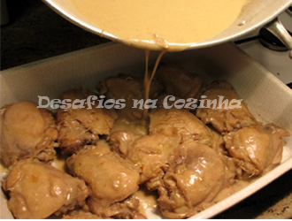 6. Numa terrina de ir ao forno, coloquei as coxas de frango e deitei o molho por cima.