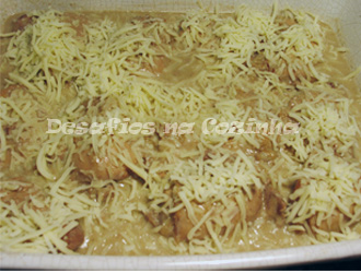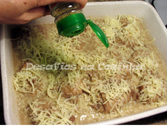 7. Deitei por cima o queijo mozarela, polvilhei com orégãos e levei ao forno a gratinar.
