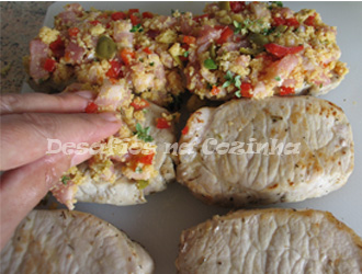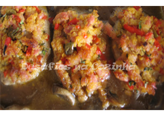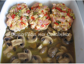 8. Deitar os cogumelos e o molho numa assadeira. Por cima dispor as fatias de carne cobertas com o preparado de bacon e pimento;