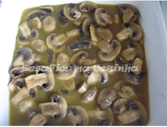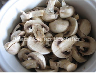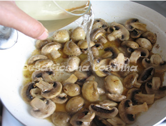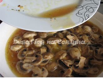 7. Deitar os cogumelos laminados na gordura onde a carne alourou e deixar só ganhar cor.