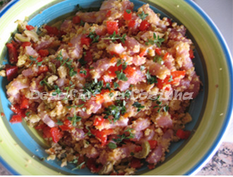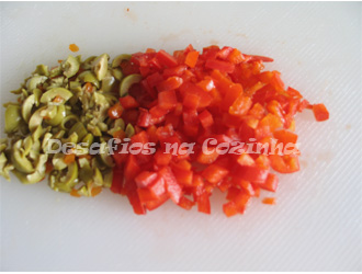 3. No momento de preparar o prato, começar por picar o pimentos e as azeitonas. Picar o bacon;