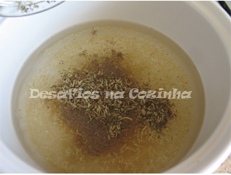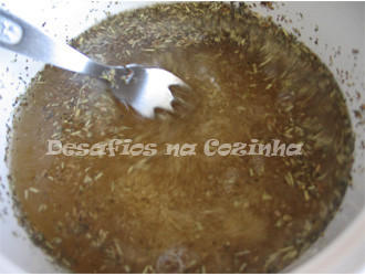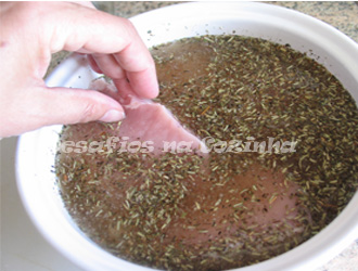 1. Fazer uma salmoura com 2 canecas de água fria, 1 colheres de sopa de sal, 2 colheres de sopa de alho em pó, pimenta, 1 colher de café de piri piri, 1 colher de sopa de mostarda, 1 colher de chá de louro em pó e 1 colher de sopa de ervas de provence. Agitar bem a salmoura de forma a misturar os ingredientes;