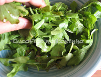 11. Para acompanhar: fazer um vinagrete com 3 colheres de sopa de azeite, 1 colher de sopa de vinagre aromático e uma pitada de sal. Temperar um molho de rúcula com o vinagrete.