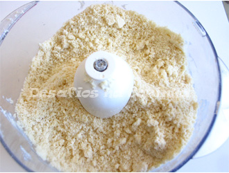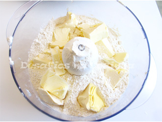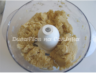 1. Num processador juntar a farinha com a manteiga fria, partida em pedaços.