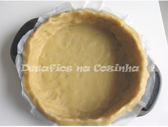 Também se pode enrolar a massa no rolo e depois desenrolar sobre a forma, mas para quem não tem prática nem sempre corre bem.