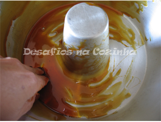 4. Barrar uma forma com caramelo e deitar as claras aos poucos, ajeitando com uma espátula e batendo com a forma na bancada, para as claras assentarem no fundo da forma e evitar a criação de bolhas de ar;