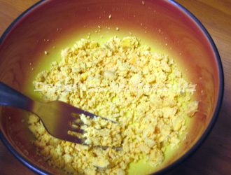3.Esmagar com um garfo as gemas, juntar o atum, os pickles picados, a maionese, a pimenta e envolver bem;