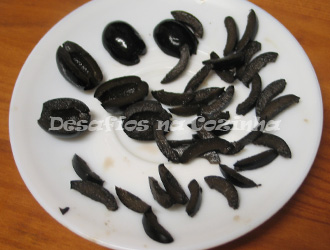 5. Cortar as azeitonas pretas ao meio e algumas destas metades em tiras;