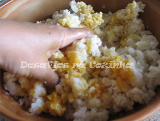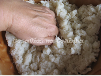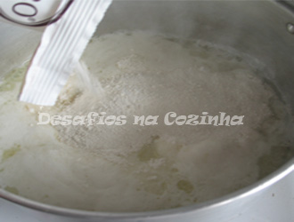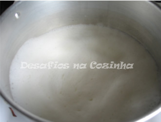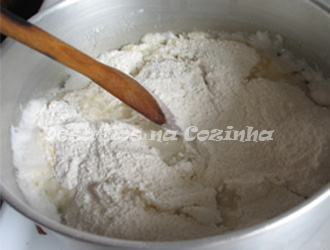 2. Escaldar no leite acabado de ferver o polvilho azedo, não é necessário mexer, bastar ajeitar o polvilho de forma a ser todo escaldado.