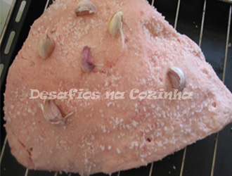 3. Partir alguns dentes de alho ao meio, mantendo a casca, e colocá-los sobre a carne, com a polpa do alho voltada para baixo;