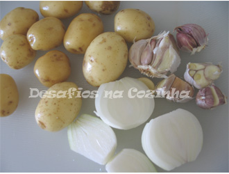 4. Lavar as batatas, partir as cabeças de alho, mantendo as cascas e partir as cebolas;