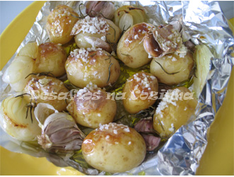 5. Com papel de alumínio fazer um “embrulho” com sal no fundo. Colocar sobre o sal as batatas, as cabeças de alho partidas,as cebolas e salpicar com sal e pimenta;