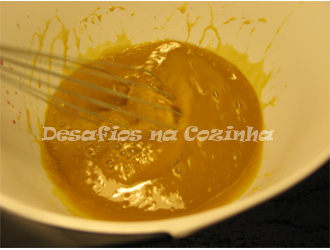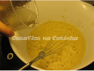 6. Adicionar a calda coada, deitando-a em fio sobre os ovos e mexendo sempre;
