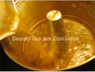 7. Untar uma forma com caramelo e verter nela a mistura do pudim. Tapar a forma;