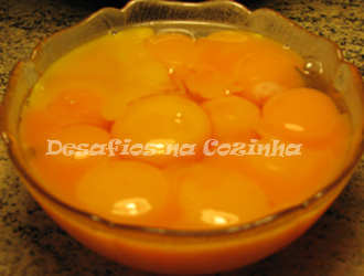 4. Entretanto, enquanto a calda arrefece um pouco, bater numa taça as 15 gemas de ovos e depois passá-las por um passador de rede;
