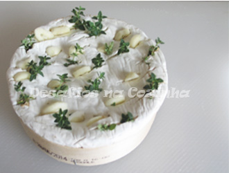 2. Fazer golpes na superfície do queijo e alternar com fatias de alho e pezinhos da erva aromática;