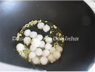 3. Numa frigideira deitar os dentes de alho picados com duas colheres de sopa de azeite;