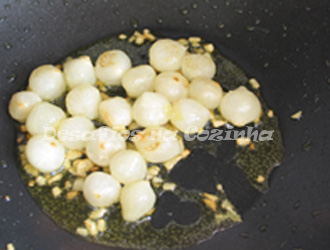 4. Quando os alhos estiverem a ficar dourados, deitar as cebolas e deixar alourar;