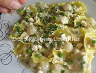 Colocar num prato e decorar com as ervilhas reservadas, para fazerem contraste com as que foram cozinhadas no molho, com pedaços de queijo feta e folhas de tomilho fresco.