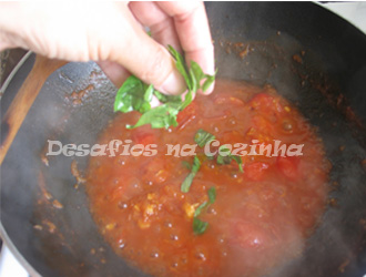 4. Juntar os tomates partidos ao meio e 4 a 5 folhas de manjericão grossamente picadas;