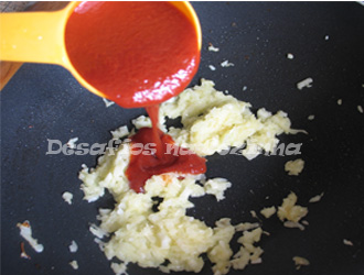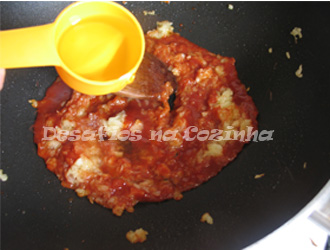3. Juntar a polpa de tomate, o vinho e a água ou caldo de carne. Ir mexendo;