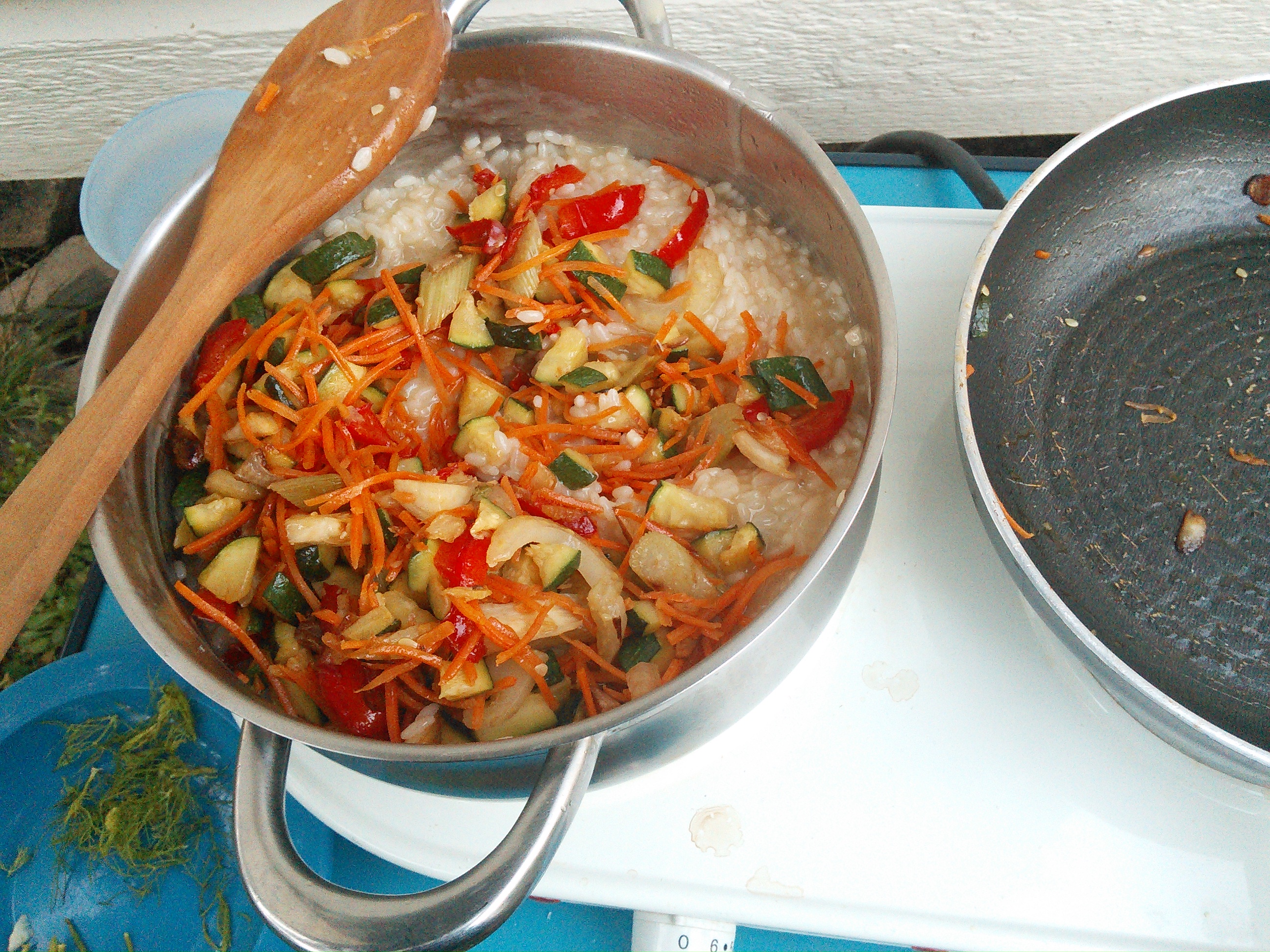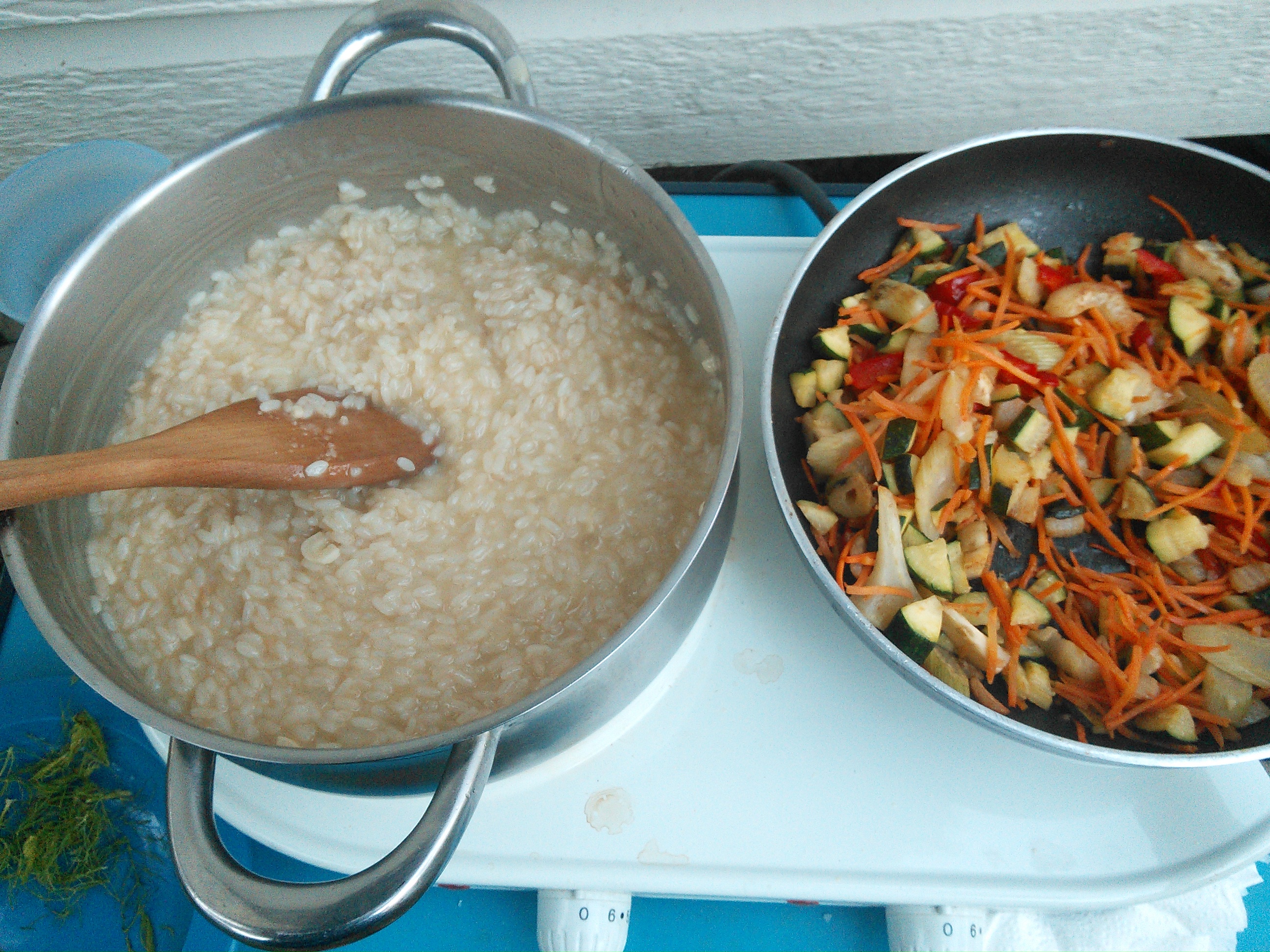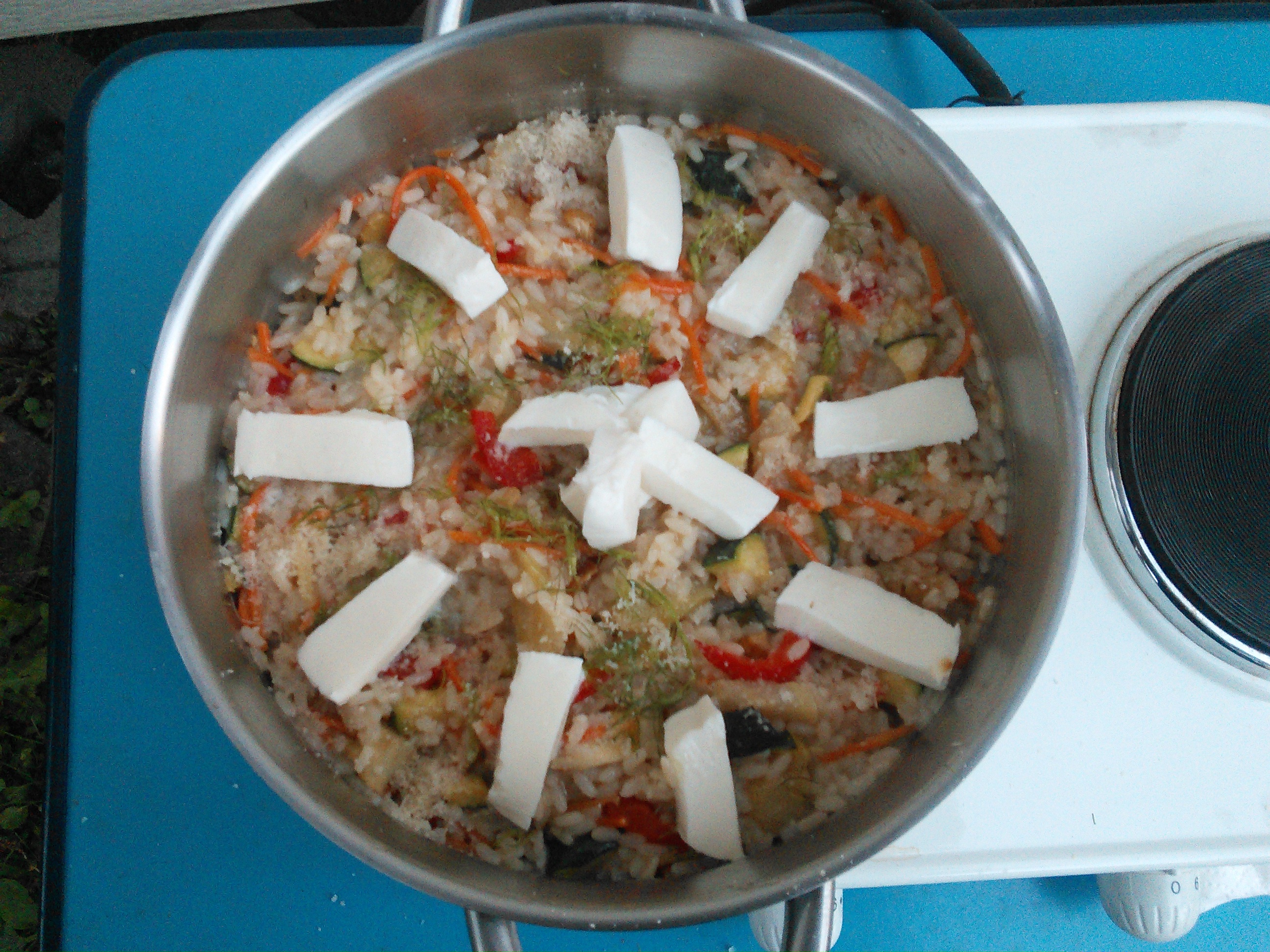 Acampar não significa comer só sandes, com um pouco de imaginação e um pequeno fogão de campismo podemos fazer uns petiscos, que servidos ao ar livre ao entardecer proporcionam um jantar único. Um dos meus petisco no campismo foi risoto com legumes.