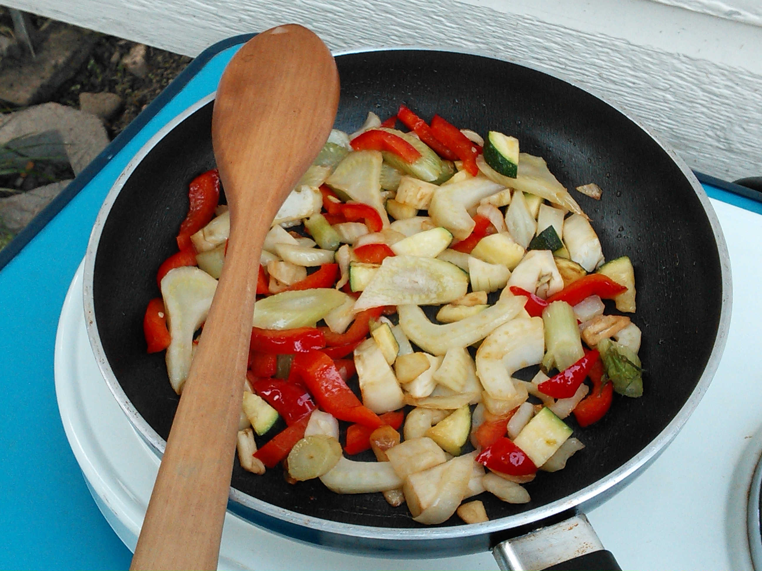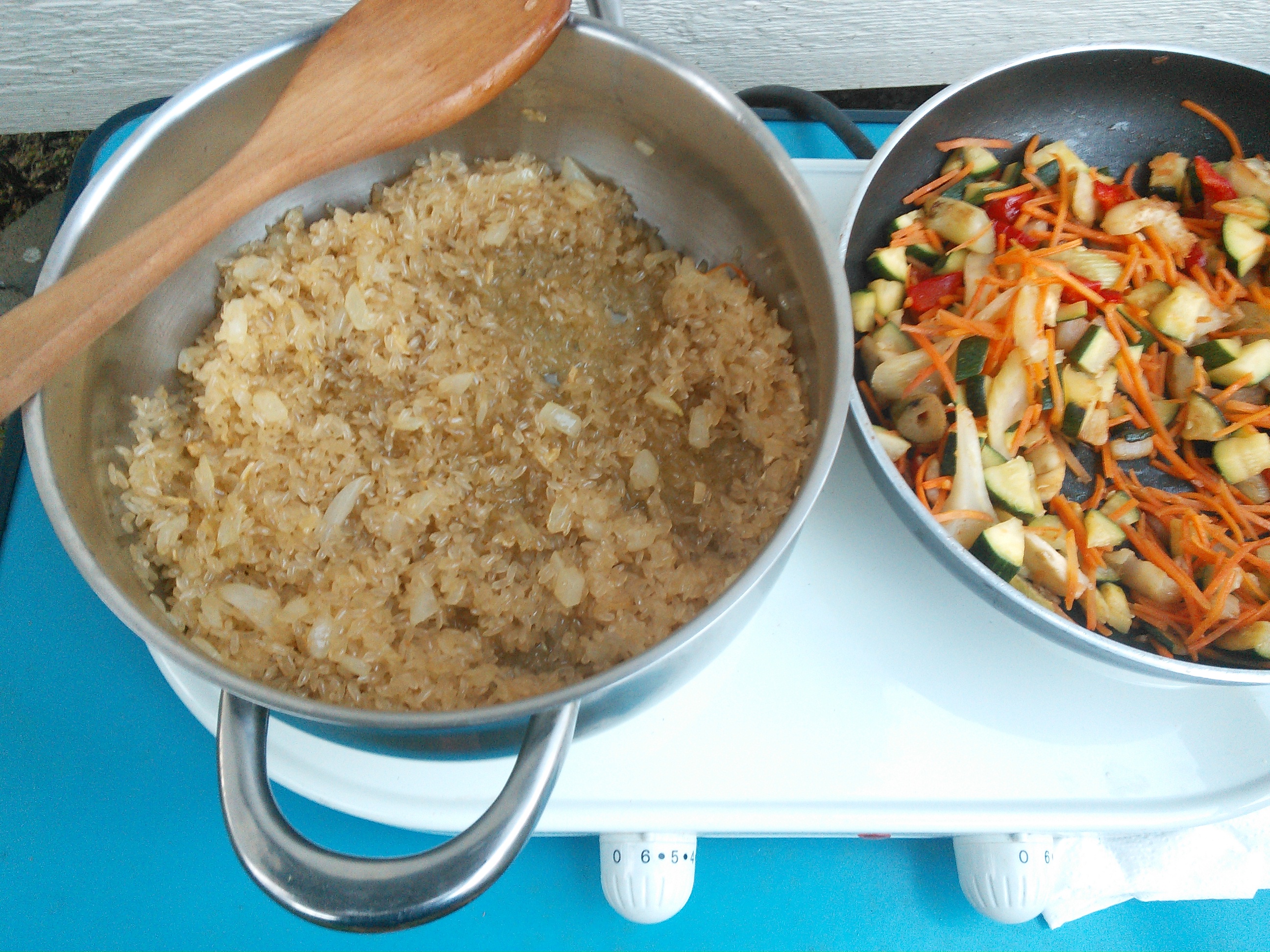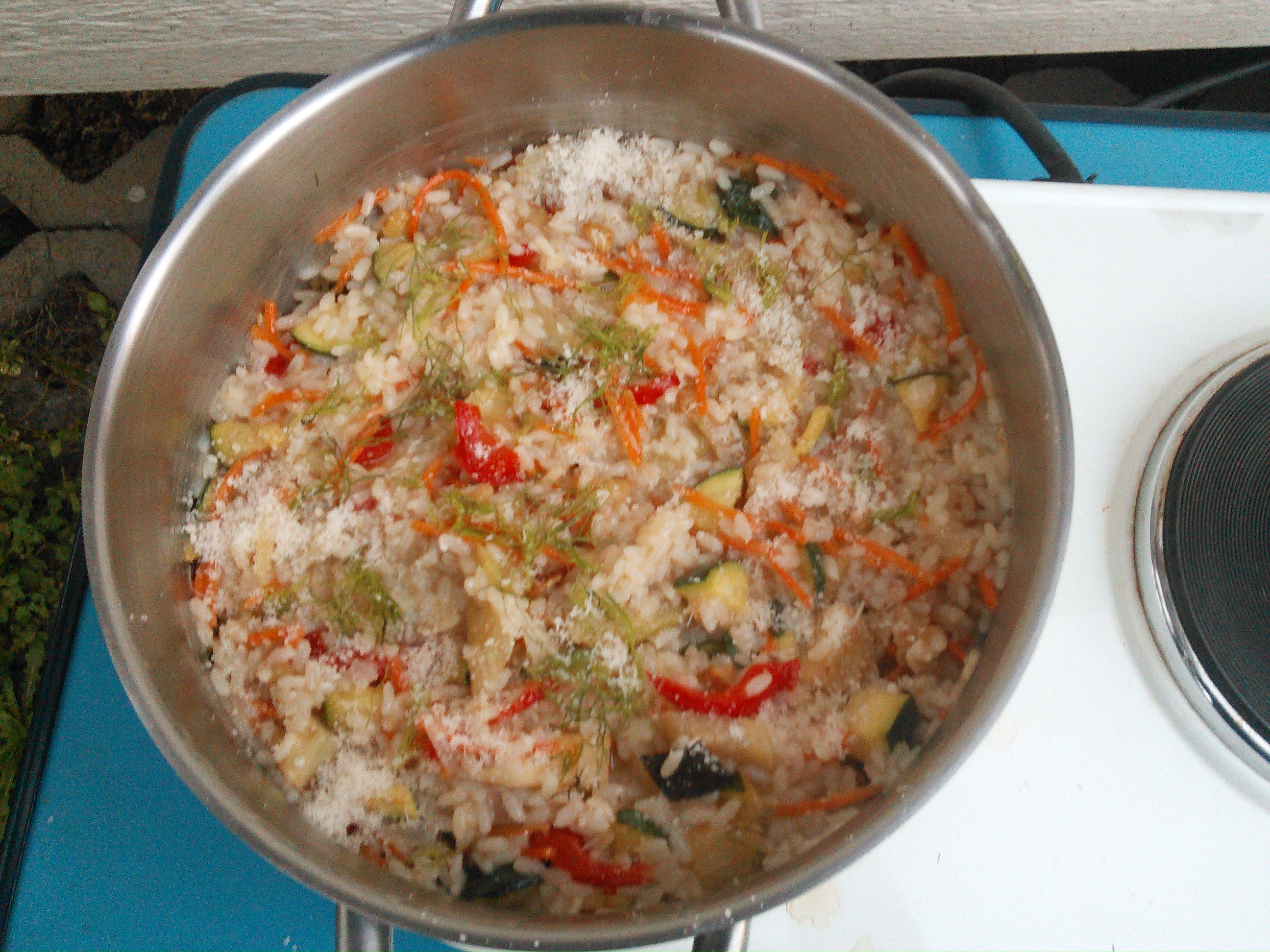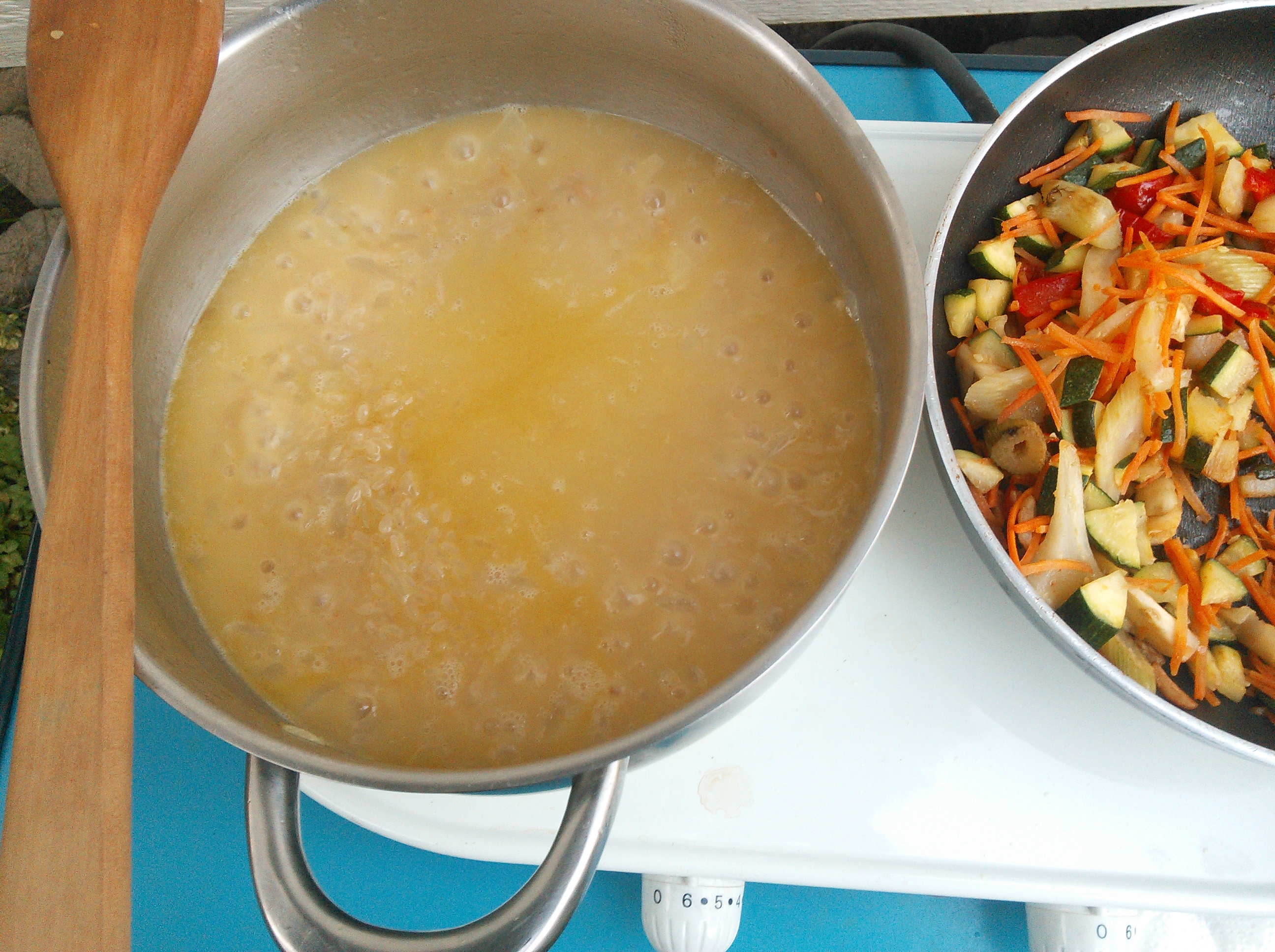 Acampar não significa comer só sandes, com um pouco de imaginação e um pequeno fogão de campismo podemos fazer uns petiscos, que servidos ao ar livre ao entardecer proporcionam um jantar único. Um dos meus petisco no campismo foi risoto com legumes.
