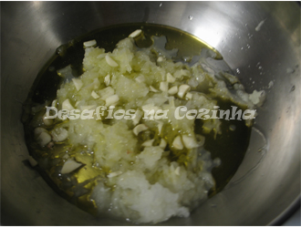 8. Ralar uma cebola e deitar numa frigideira juntamente com alho picado e azeite.