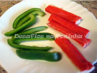 3. Cortar o pimento verde em tiras e fritar em azeite e alho;