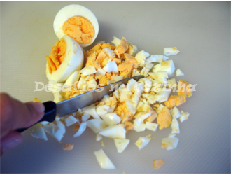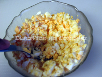 4. Picar os ovos cozidos e misturar uma colher de azeite (pode ser o azeite de fritar as tiras de pimento se não estiver queimado).