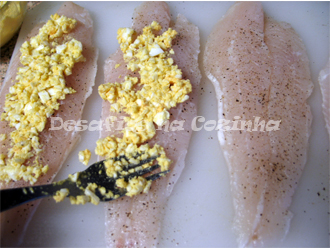 6. Barrar os filetes com o ovo. Colocar a barra de delicias do mar ou camarão e começar a enrolar;