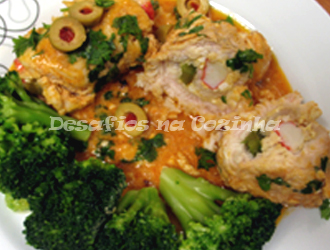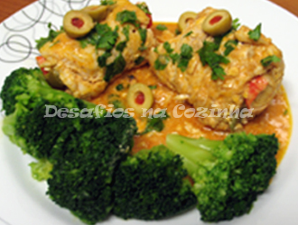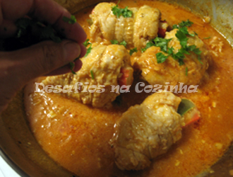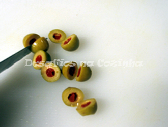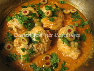 12. Polvilhar com coentros picados e guarnecer com as azeitonas recheadas com pimento partidas ao meio.