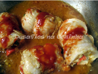 9. Juntar o concentrado de tomate diluído em água e ir envolvendo os rolos no molho;