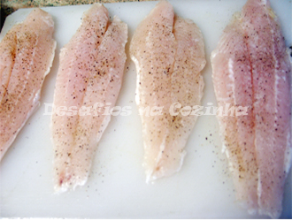 5. Colocar numa tábua de cozinha os filetes, com a parte exterior do lombo para baixo e temperá-los com sal e pimenta;