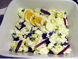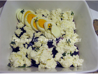 3. Numa tigela temperei as fatias de beterraba com azeite, vinagre balsâmico, sal e pimenta;