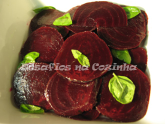 5. Num prato de servir, coloquei as rodelas de beterraba, o mais escorridas possível, intercaladas com folhas de manjericão. Reservei uma fatia para a decoração;