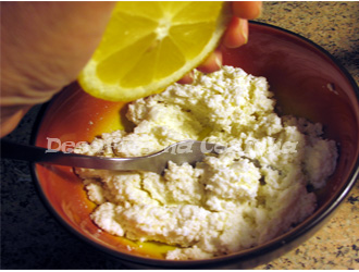 4. Em outra tigela juntei o requeijão com sal, uma colher de chá de azeite, sal, pimenta, sumo de limão e alguma raspa de casca de limão (pode também adicionar-se folhinhas de tomilho de limão);