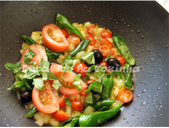 4. Passado cerca de 4 a 5 minutos, adicionar as azeitonas, os gomos do tomate e o manjericão cortado em tiras. Deixar cozinhar mais cerca de 5 minutos.