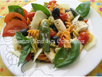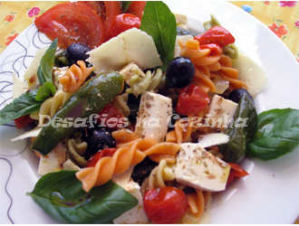 7. Em cada um dos pratos colocar a salada de espirais e decorar com os gomos de tomate e folhas de manjericão.