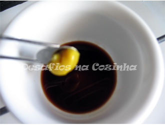 5. Entretanto para o vinagrete, misturar bem numa taça pequena, o vinagre balsâmico, a mostarda, o sal e a pimenta.